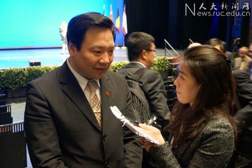 签字仪式结束后,中方三所学校的代表团成员应邀参加了习近平主席在欧洲学院的演讲会,陈雨露校长在演讲会结束后接受了新华社、人民日报记者的采访。